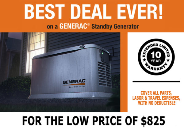 If you have a Generac Air cooled generator installed in 2013 or later, you may be eligible for a special Extended Warranty offering from Innovative Electric. You may purchase a 10 Year Extended warranty to cover all Parts, Labor and Travel expenses, with no deductible, for the low price of $825. Once this coverage is in place, any needed repairs will be done by Innovative Electric’s certified technicians at no cost to you!
