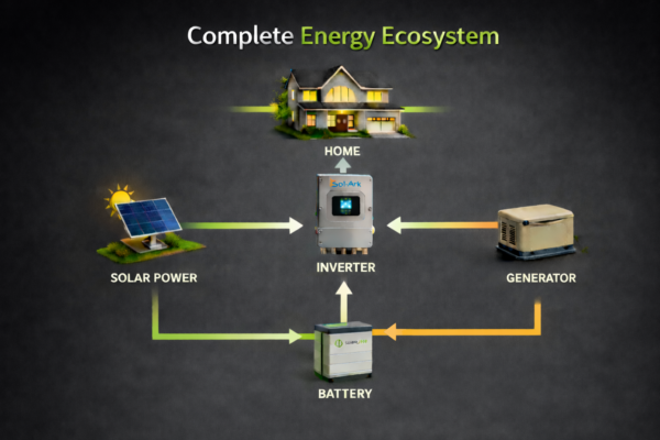 In a complete energy solution, each component has a role. Solar panels collect energy from the sun. Battery storage saves energy for later use. The inverter manages the flow of electricity. The standby generator adds dependable backup power when additional support is needed.